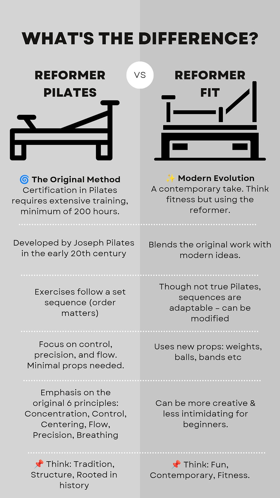 Reformer Pilates encourages focus, breath, and mindful movement, helping you tune into your body. Reformer Fit adds flow, intensity, and functional strength, giving you a practice that’s both disciplined and dynamic.
